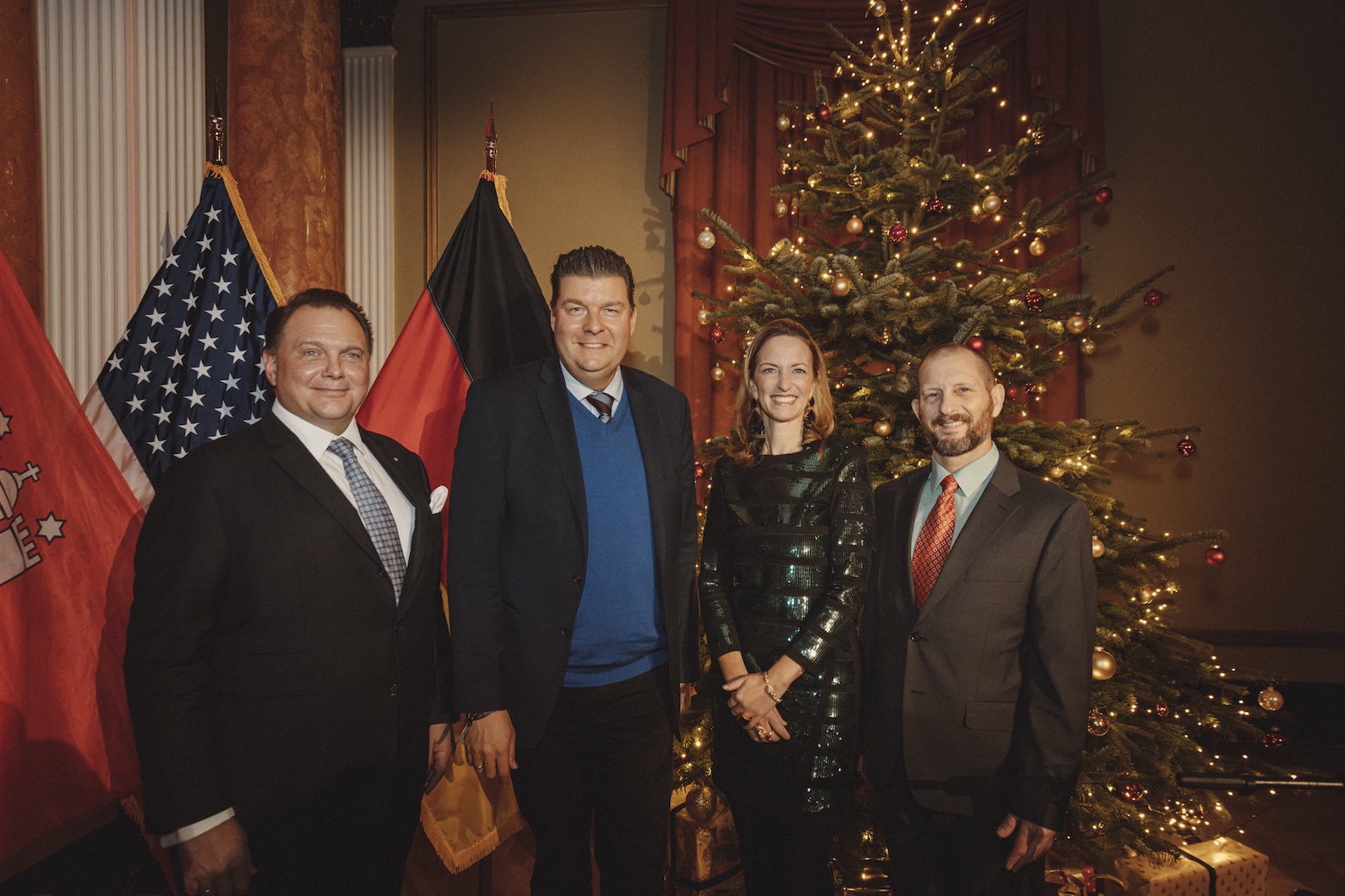 Offiziell die Gäste begrüßten und den Abend eingeläutet haben (v.li.) Lars Dünker, Vorstand DERAG, Dr. Andreas Dressel, Senator Finanzen & Bezirke, Dorothée Schlereth und US-Generalkonsul Scott Woodard, Derag - Christmas Tree Lighting Hamburg, BILDER CREDIT: Jakob Schubert für Living Hotels