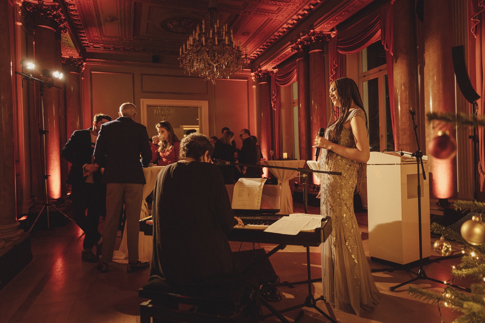 Diese Worte waren für den Abend Programm: Momente der Gemeinschaft zu feiern und Traditionen zu pflegen. Bei kulinarischen Köstlichkeiten des Münchner Gastronomen Michael Schlotter, der während seiner Zeit als Küchenchef im Gourmetrestaurant „Aubergine“ in Starnberg einen Michelin-Stern erkochte und weihnachtlichen Soulklängen von Sängerin Johanna Schneider gab es unter den 180 Gästen – darunter Susan Elbow (ehemalige US-Generalkonsulin Hamburg), Iris von Arnim (Modedesignerin), Christian Völkers (Engel & Völkers), Michel Abdollahi (TV-Journalist), Lenn Kudrjawizki (Schauspieler), Kaylo Motaung, (Sänger), Niklas Liepe (Opus Preisträger), Undine & Harald Baum (Pantaenius Versicherung), Anita & Bruder Christian Paul Hinneberg (Unternehmer), Ulf Gehrckens (Aurubis), Monika Schorn (Richterin a.D., Vorstand Weisser Ring), Jan Störmer (Architekt), Nataly Langner (Langner Stiftung), Lars & Kai Rose (Klambt Verlag), die Architekten des Hauses Martin Murphy & Stephen Williams etc. – regen Austausch, viel Lachen und jede Menge Leuchten in den Augen.
