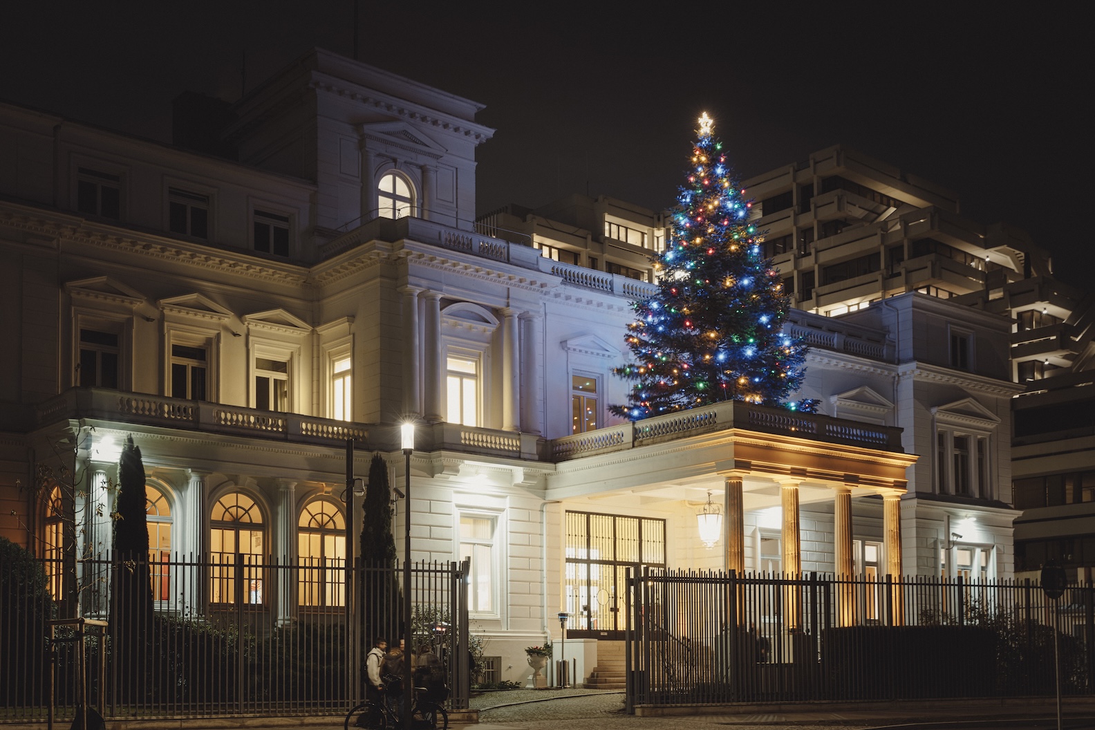 Und so fand nun, passend zum Start in die Adventszeit, am 1. Dezember und zum zweiten Mal die Einladung zur sogenannten Christmas Tree Lighting Ceremony im Namen des neuen Hausherrn gemeinsam mit dem US-Generalkonsulat statt. Ein 12 Meter großer, kerzengerader Baum mit über 300 Lichtern wurde um Punkt 18 Uhr von US-Generalkonsul Scott Woodard und Dorothée Schlereth vor den 180 Gästen erleuchtet, die es sich nicht haben nehmen lassen, die Zeremonie im Freien zu begleiten und gemeinsam den „Alle Lichter an“-Countdown einzuläuten.