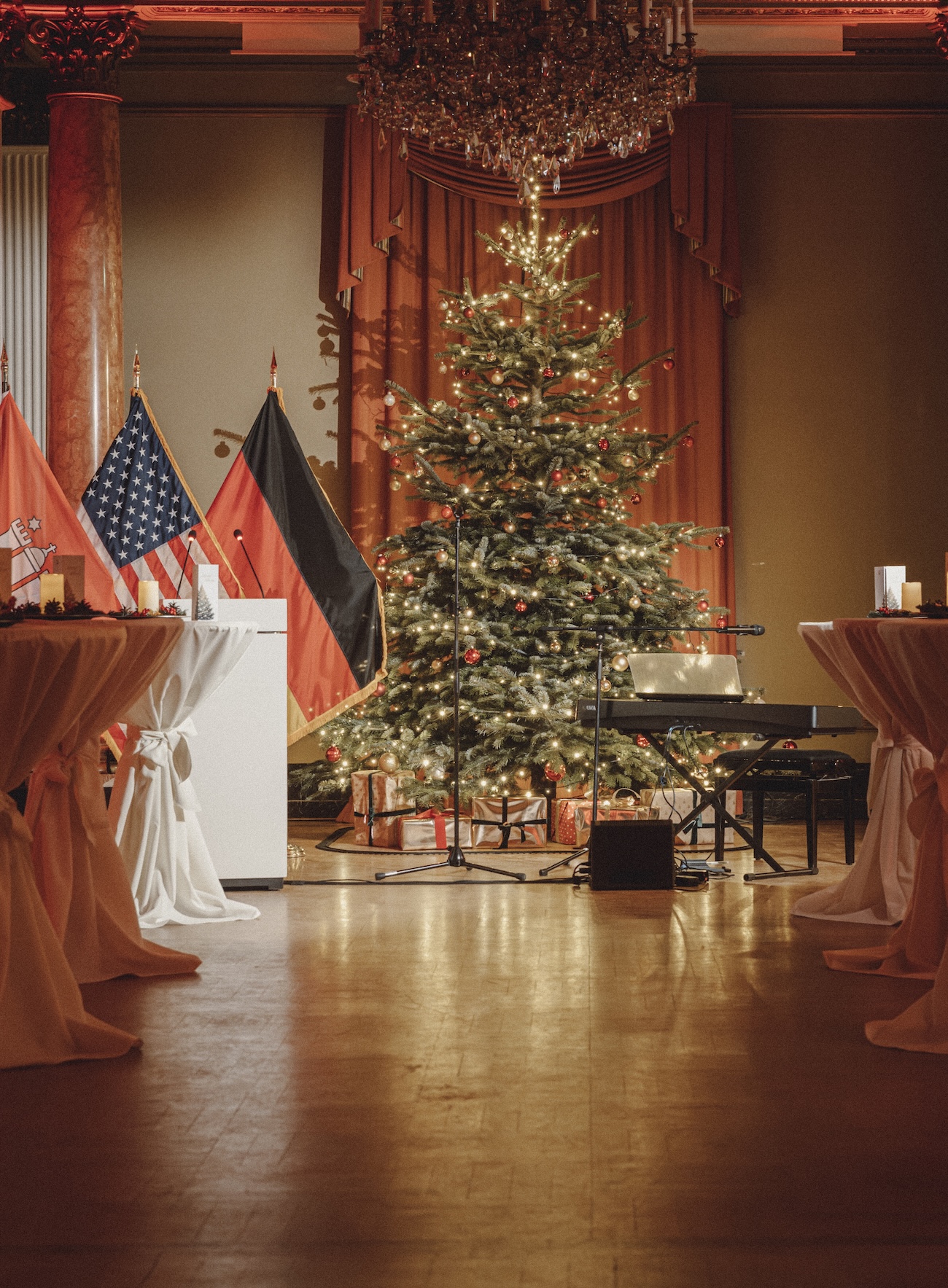 Und so fand nun, passend zum Start in die Adventszeit, am 1. Dezember und zum zweiten Mal die Einladung zur sogenannten Christmas Tree Lighting Ceremony im Namen des neuen Hausherrn gemeinsam mit dem US-Generalkonsulat statt. Ein 12 Meter großer, kerzengerader Baum mit über 300 Lichtern wurde um Punkt 18 Uhr von US-Generalkonsul Scott Woodard und Dorothée Schlereth vor den 180 Gästen erleuchtet, die es sich nicht haben nehmen lassen, die Zeremonie im Freien zu begleiten und gemeinsam den „Alle Lichter an“-Countdown einzuläuten.
