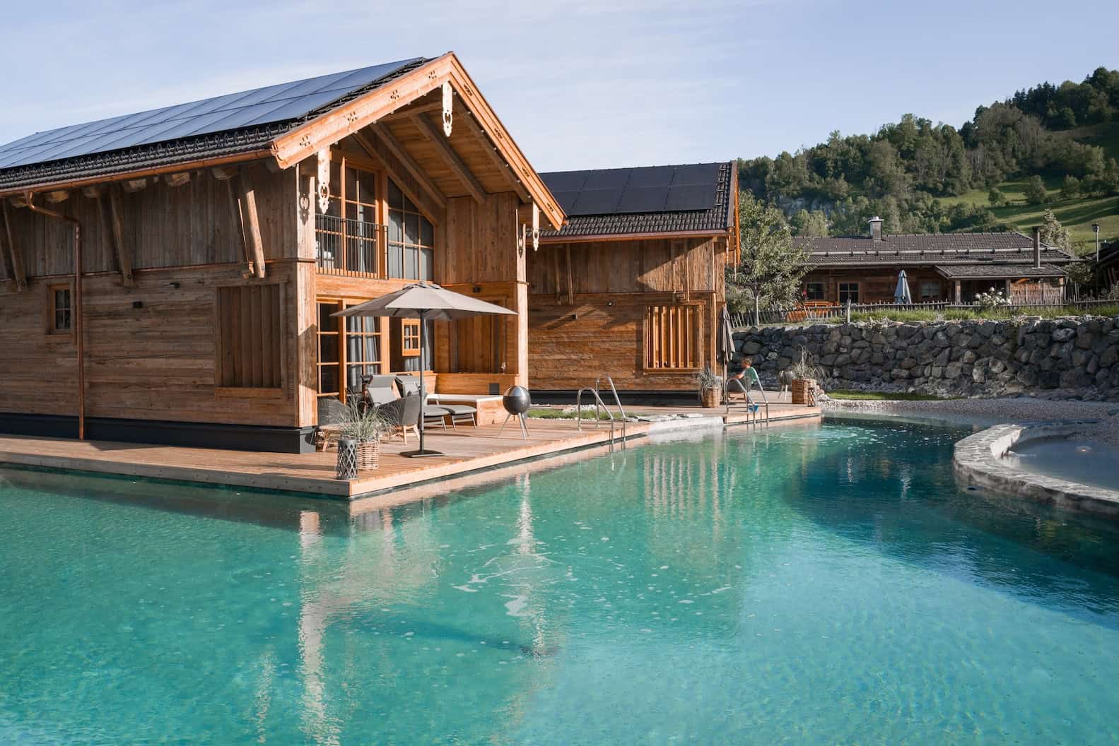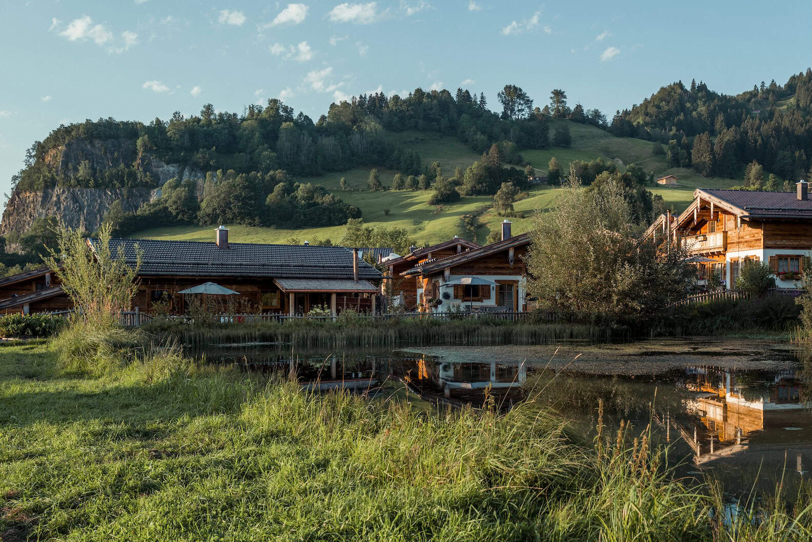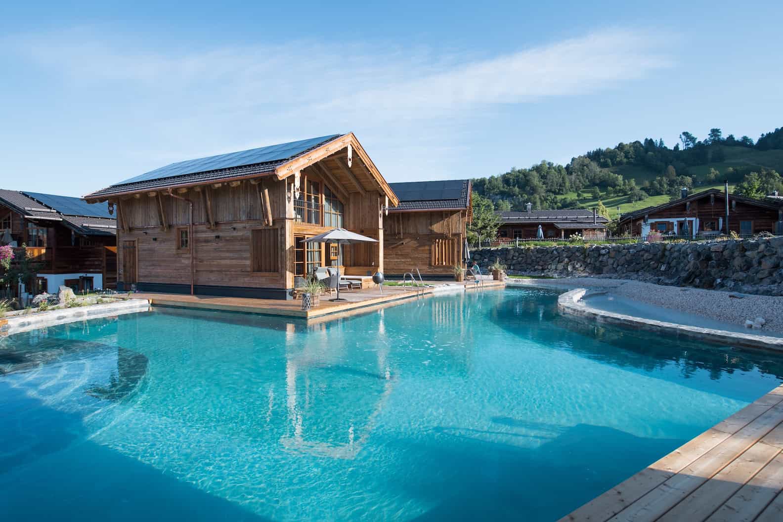 Eingebettet zwischen alten Obstbäumen, sprudelnden Quellen und weitläufigen Wiesen entfalten die Alpzitt Chalets ihren ganz besonderen Zauber. Der neu angelegte Naturbadesee wird aus kristallklaren Bergquellen gespeist und fügt sich harmonisch in die Landschaft ein – ein stiller, beinahe meditativer Ort, an dem man nur das leise Plätschern des Wassers und den Wind in den Bäumen hört. Ergänzt wird das Naturidyll vom historischen Mühlweiher, der wie ein kleiner Rückzugsort für Mensch und Tier wirkt.