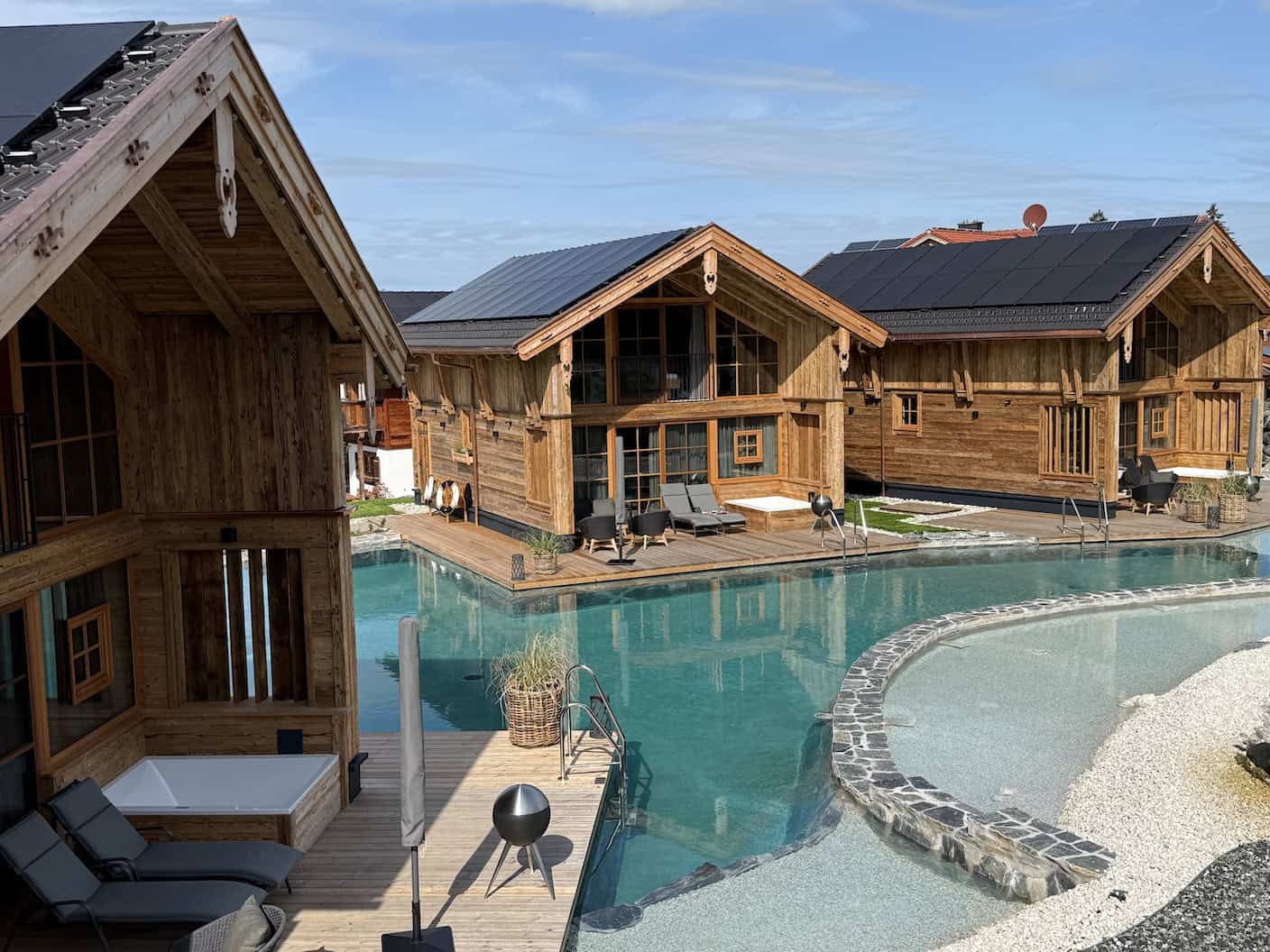 Das Panorama Chalet macht das Erlebnis komplett: seine erhöhte Lage ermöglicht einen unvergleichlichen Rundumblick über das Chaletdorf und den Naturbadesee. Der Whirlpool wird hier zur Aussichtstribüne für spektakuläre Sonnenuntergänge über dem Allgäu.