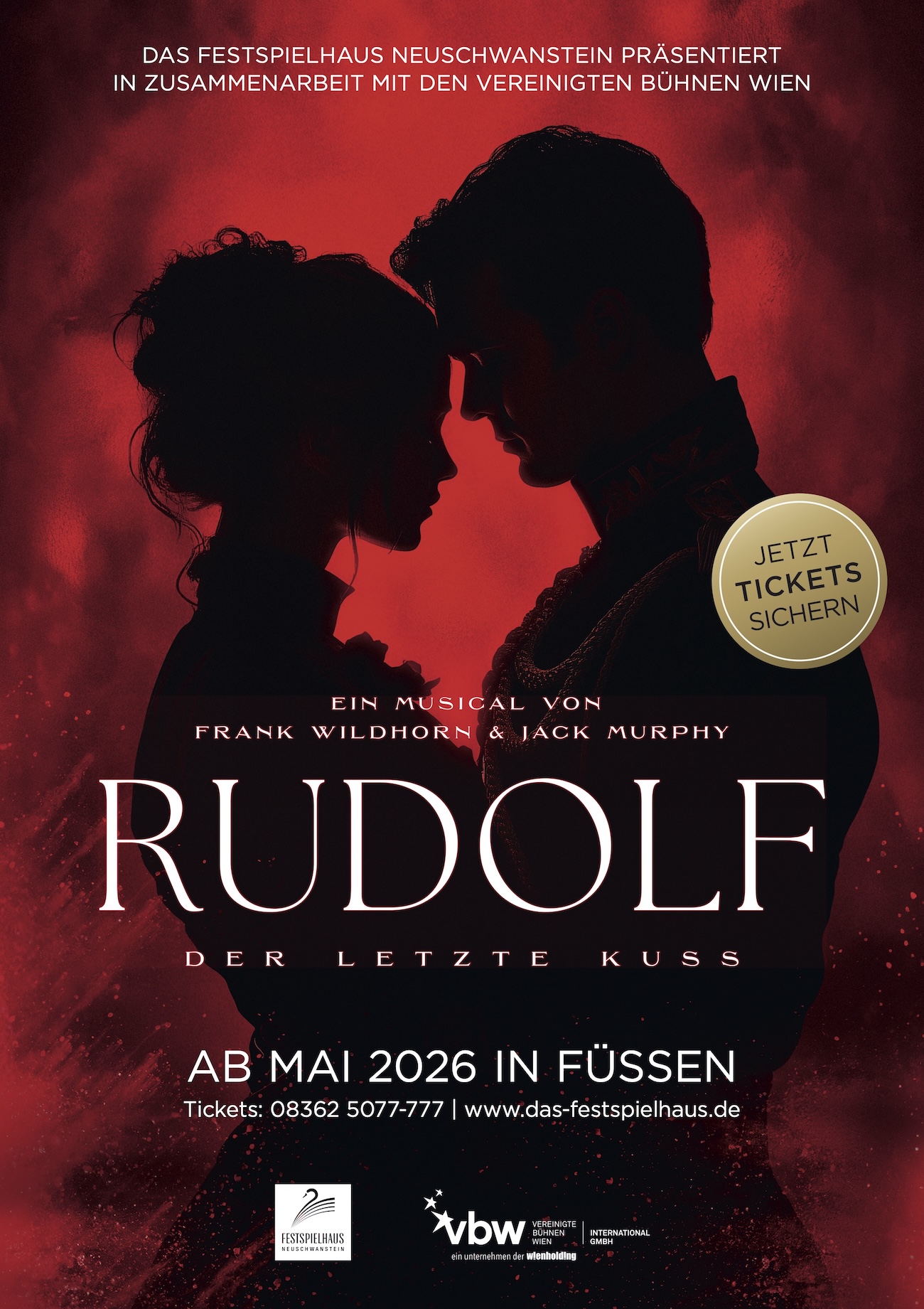 Das Festspielhaus Neuschwanstein in Füssen kündigt für das Frühjahr 2026 ein besonderes Highlight an: Erstmals in Deutschland wird RUDOLF – DER LETZTE KUSS, das Erfolgs-Musical der Vereinigten Bühnen Wien (VBW) von Star-Komponist Frank Wildhorn gezeigt – auf der einzigartigen Bühne vor der Kulisse des Festspielhauses Neuschwanstein. Die dramatische Liebesgeschichte um Kronprinz Rudolf von Österreich und die junge Baronin Mary Vetsera mit Wildhorns mitreißender Musik und Jack Murphys gefühlvollen Texten garantieren ein Erlebnis der Extraklasse. Das Publikum darf sich auf großes Musicalmit opulenter Inszenierung und emotionaler Tiefe freuen.