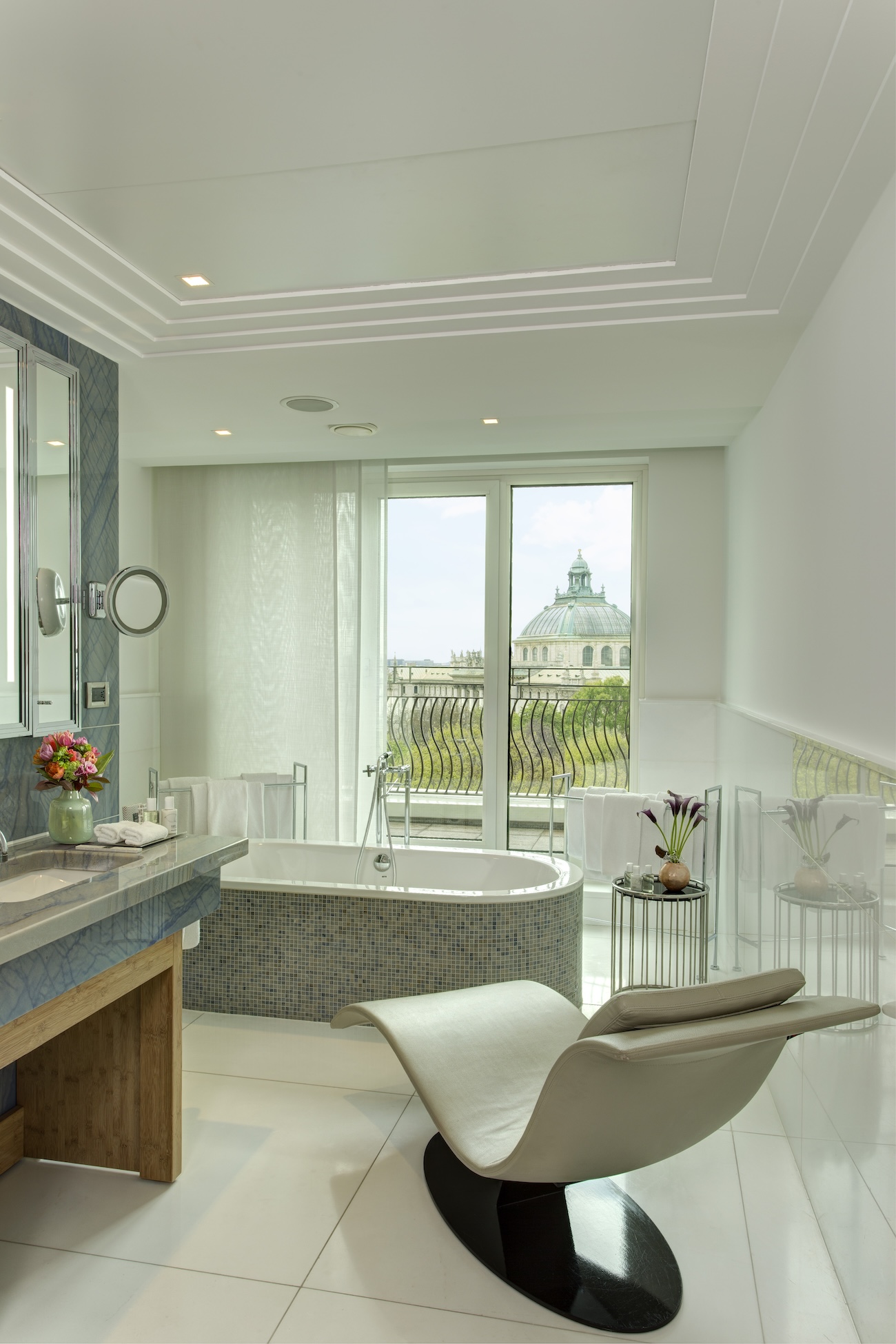 Die private Außenterrasse bietet einen atemberaubenden Blick über die Baumkronen des Alten Botanischen Gartens auf diverse, architektonische Wahrzeichen Münchens. Die 200 Quadratmeter große Suite besticht durch ein offenes Raumkonzept, bei dem die verschiedenen Räume durch große Doppeltüren miteinander verbunden sind und so nicht nur ein Gefühl von Weite vermittelt wird, sondern gleichermaßen ein Gefühl der Verbundenheit und des fließenden Austauschs.