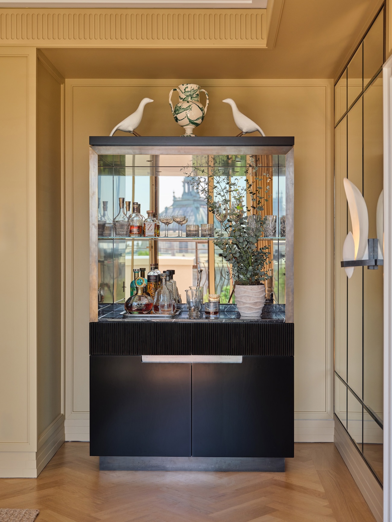 Im Kontrast dazu steht der neu gestaltete, maßgefertigte Barschrank aus schwarzem Stein und Holz mit raffinierten Details aus antikem Messing.