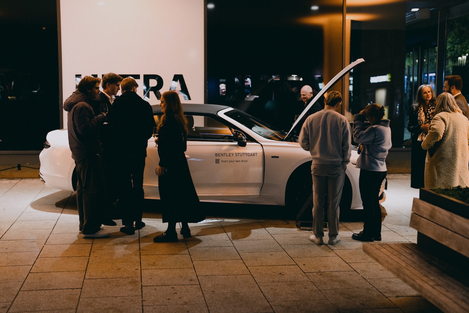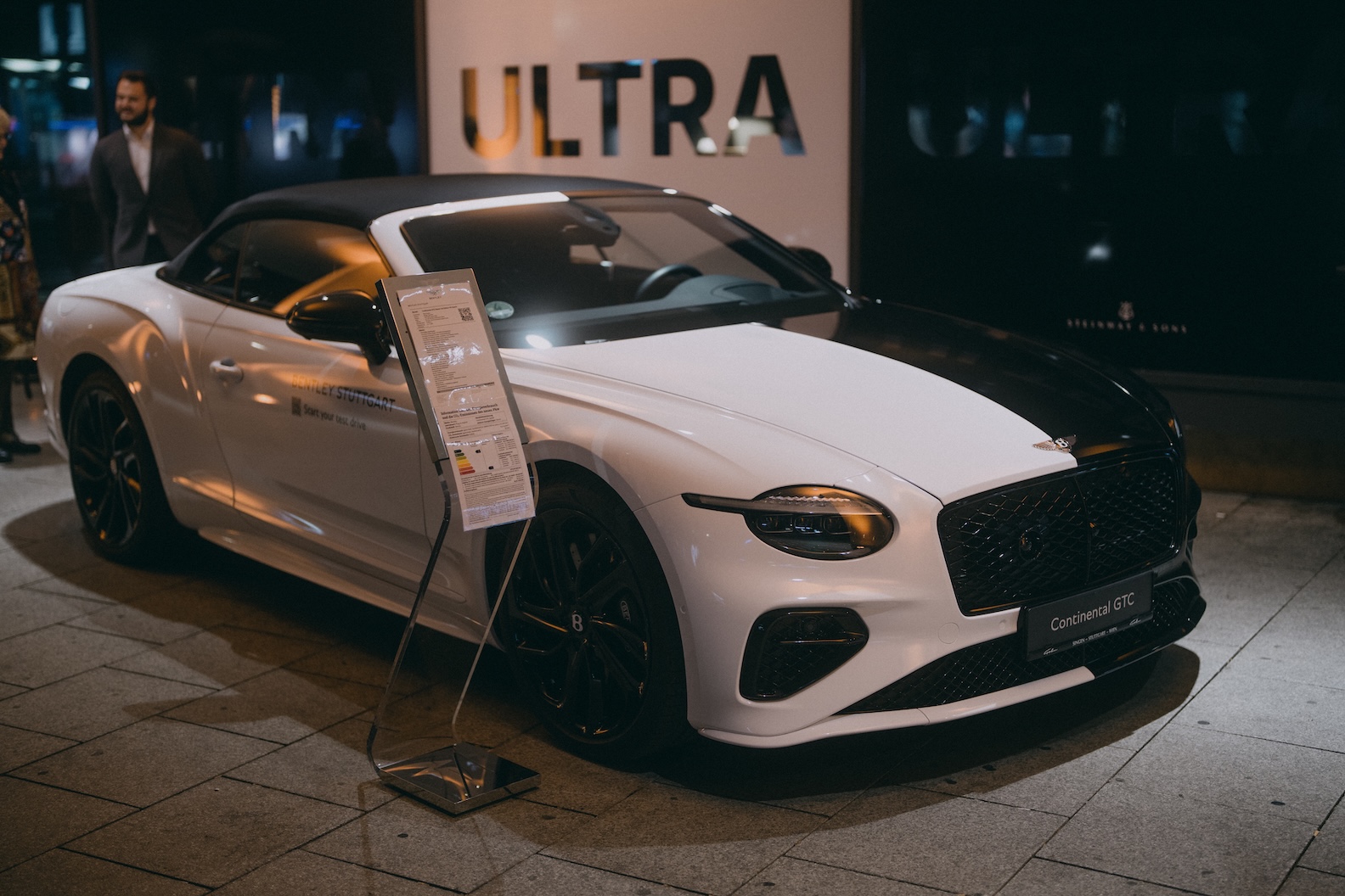 Ein besonderer Blickfang – und ein bewusstes Statement seitens Bentley Stuttgart – war der präsentierte Bentley Continental GTC Speed, der für das Event in einer auffälligen Schwarz-Weiß-Folierung gestaltet wurde. Die Farbgestaltung orientierte sich an der neuen Ultra Limited Edition von Steinway & Sons und setzte die gestalterische Verbindung zwischen beiden Marken visuell eindrucksvoll in Szene. Für Bentley bot sich damit die Möglichkeit, die eigene Designphilosophie im Kontext eines kunstvollen Abends auf besondere Weise erfahrbar zu machen.