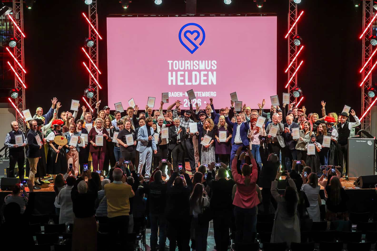 Strahlende Preisträgerinnen und Preisträger: die Tourismusheldinnen und -helden 2026. | Bildnachweis: Messe Stuttgart